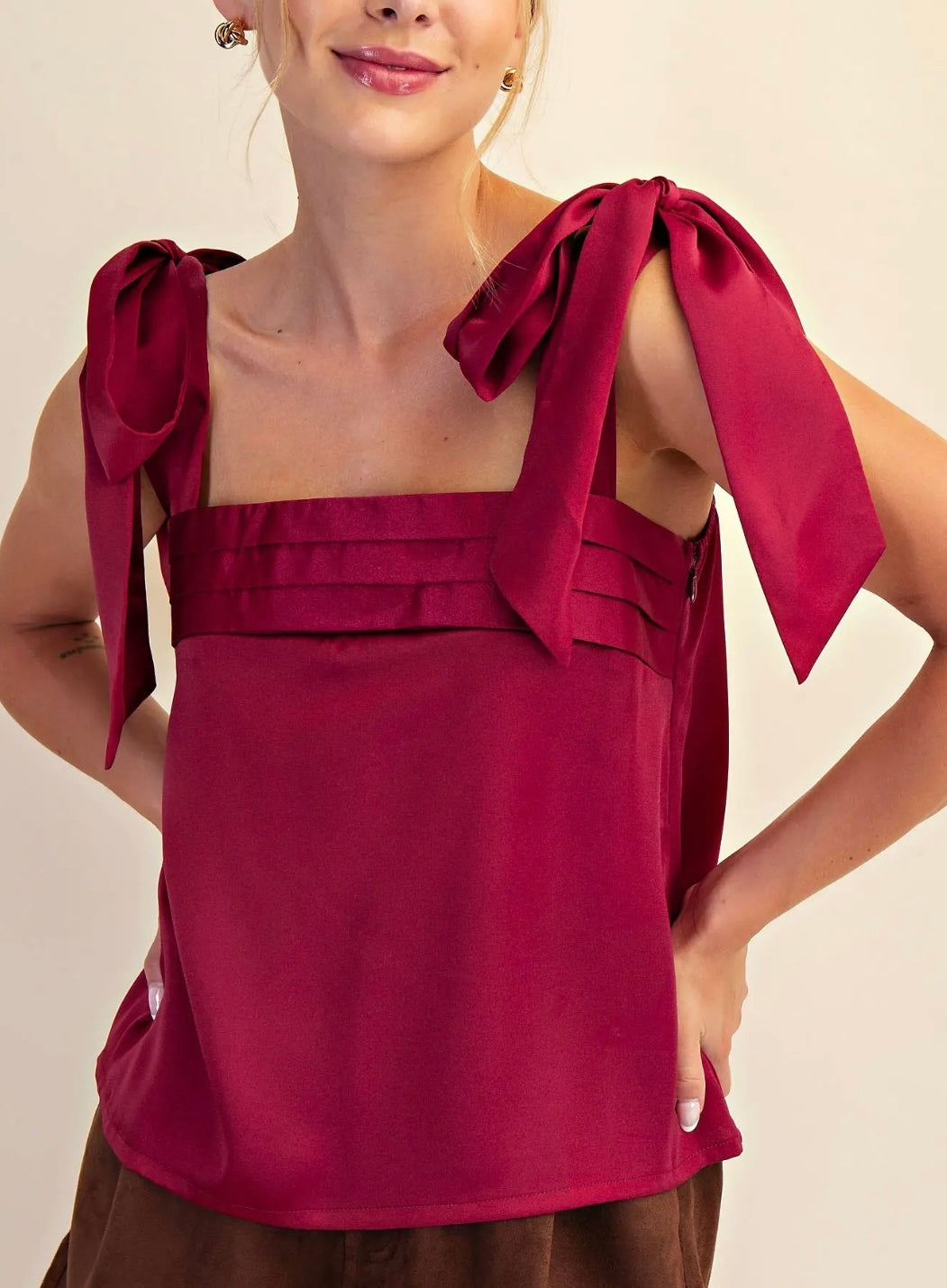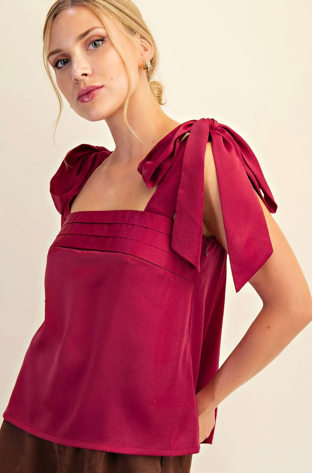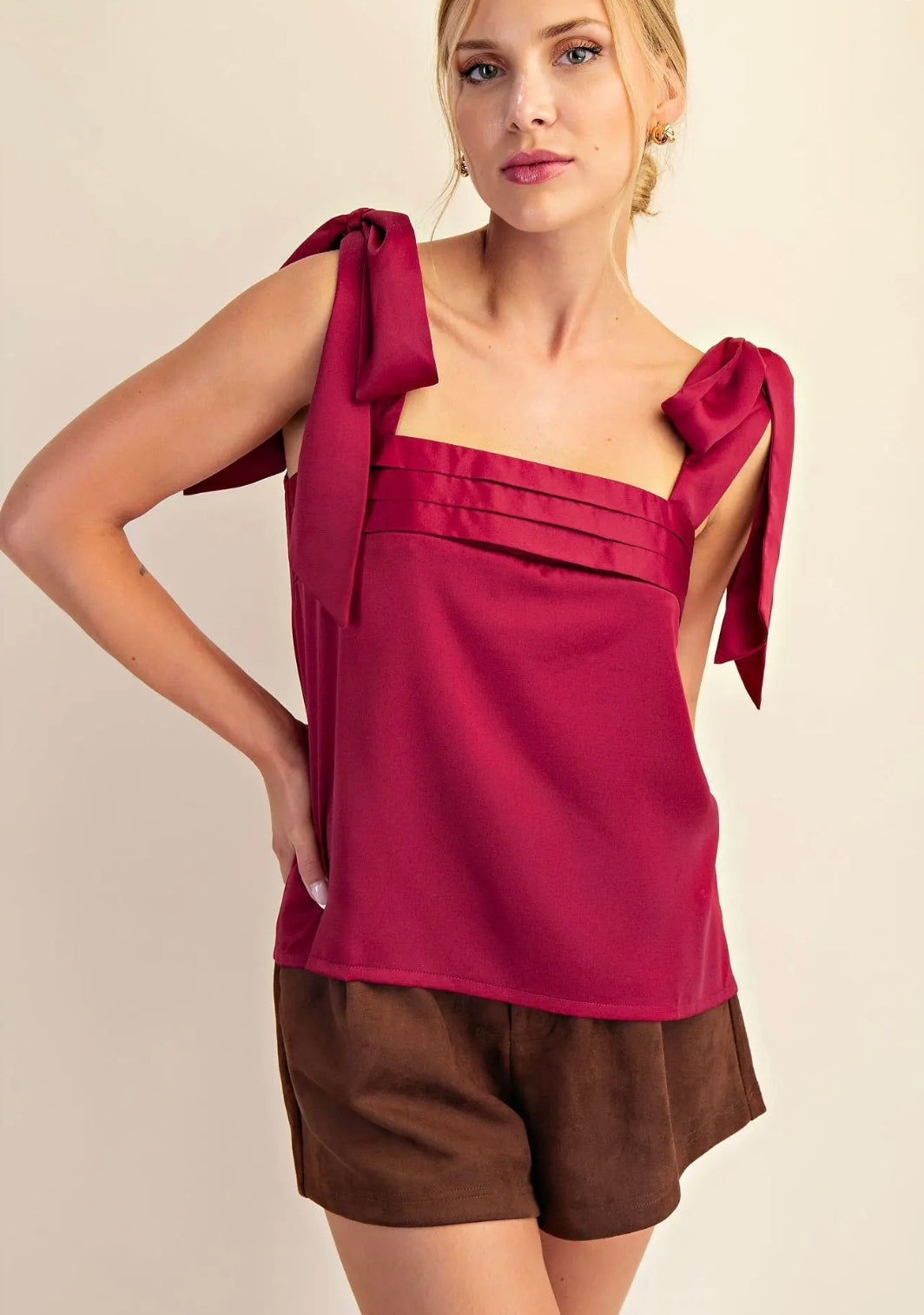 Elevate your style with this playful burgundy top featuring charming tie details on the shoulders. Crafted from lightweight fabric, it offers comfort and versatility, perfect for dressing up or down to match your mood. This gorgeous top adds a fun, flirty touch to any outfit!
